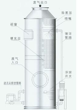 原理及構(gòu)造:設(shè)備本身包含有本體、填充層、除霧層、循環(huán)灑水管路,及循環(huán)水槽等。