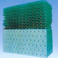 特點:折波型的板面加強了水流和空氣和擾流,其散熱面積增長系數較大。板面上圓錐形突出件,既起保持片距的作用,又能使片體之間落下的水流層濺散成細小水滴,使這種填料具有點滴薄膜式性能,增加散熱面積,提高冷卻效果。
